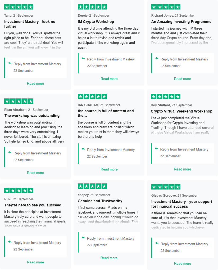 With investing, it all comes down to one final thing before you make any investment – RESEARCH. And thorough research at that. You need to be absolutely sure the company you are investing in is reputable with a good track record. You should apply that same approach when assessing our credentials, background and expertise. The thing to remember, is that Investment Mastery offers financial EDUCATION pas investment advice. Nor do we make investments for you. We are not brokers. That means you have 100% control of your money and how you invest that in your education and training with us. Oh, and by the way, our 1000 5-Star reviews on Trustpilot should speak for themselves!
